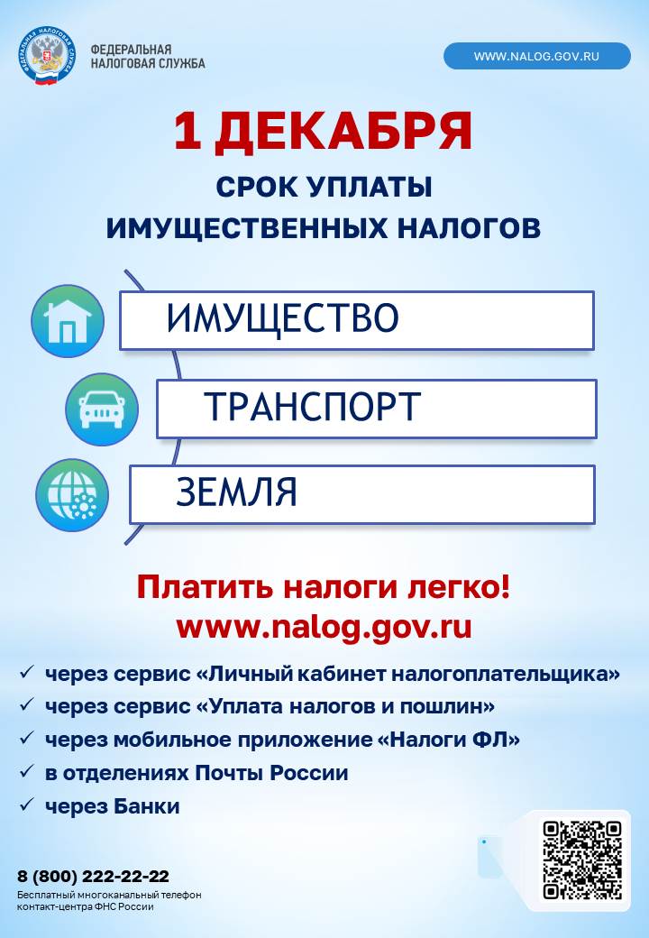 Уплатить имущественные налоги удобнее всего онлайн через портал госуслуг, а также через Личный кабинет налогоплательщика или сервис «Уплата налогов и пошлин» на сайте ФНС России, но можно это сделать через кассы или терминалы банков и офисы Почты России. Срок уплаты – не позднее 1 декабря.